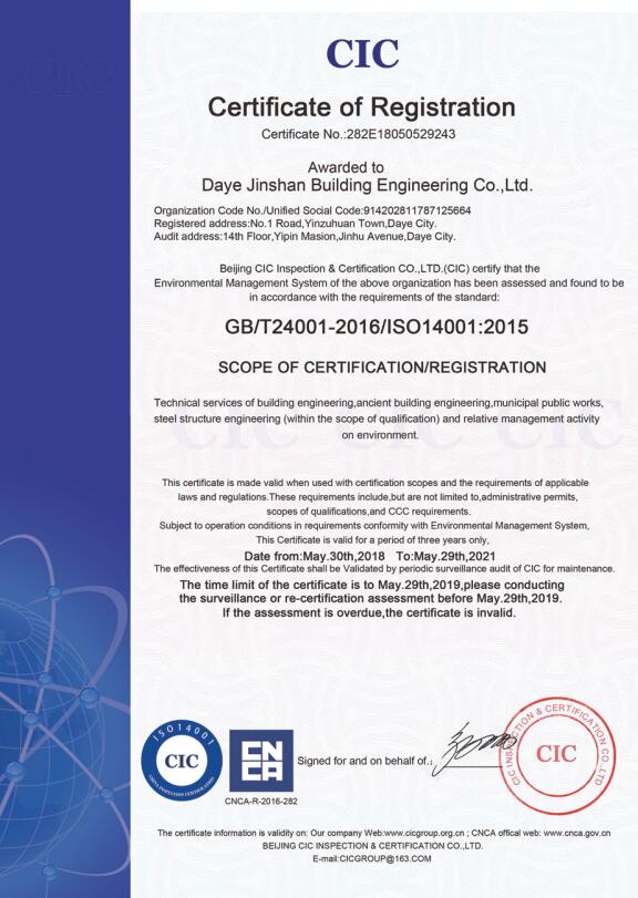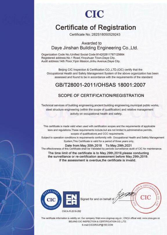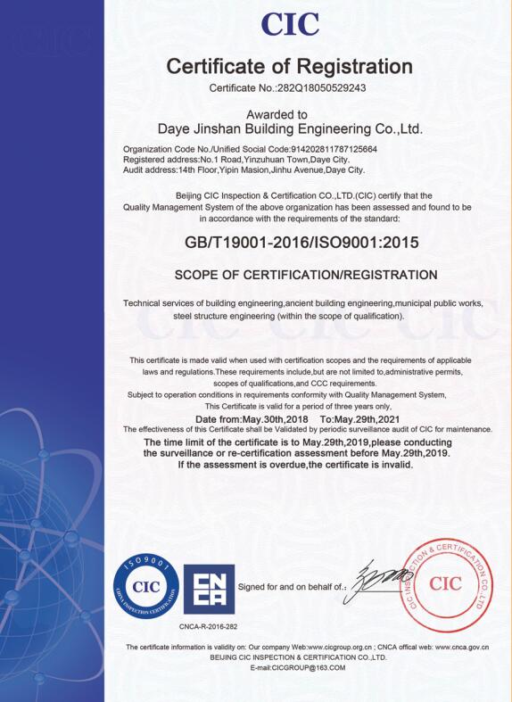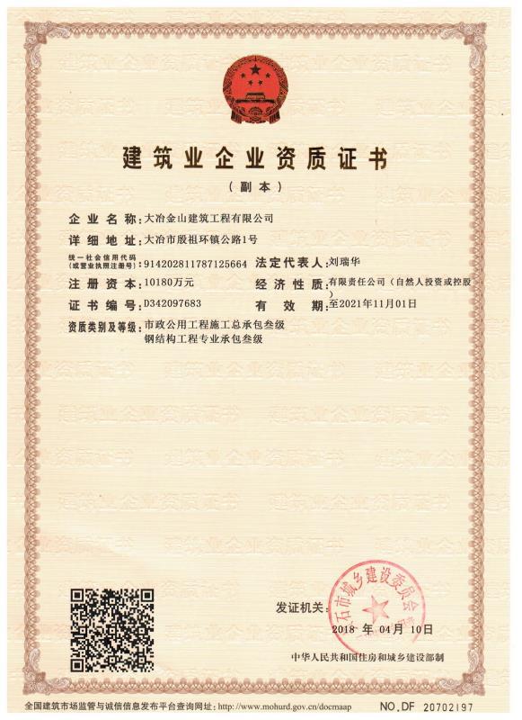 大冶金山建筑工程有限公司始建于1984年,屬鎮(zhèn)辦集體企業(yè)。1997年改制為大冶山建筑工程有限責任公司,屬股份制企業(yè)。2013年更名為大冶金山建筑工程有限公司,2018年3月公司資源重組,公司注冊資金達到10180.00萬元,公司法定代表人為劉瑞華。公司具有古建筑工程專業(yè)承包壹級、建筑工程施工總承包貳級、市政工程總承包叁級、鋼結(jié)構工程專業(yè)承包叁級資質(zhì)。
